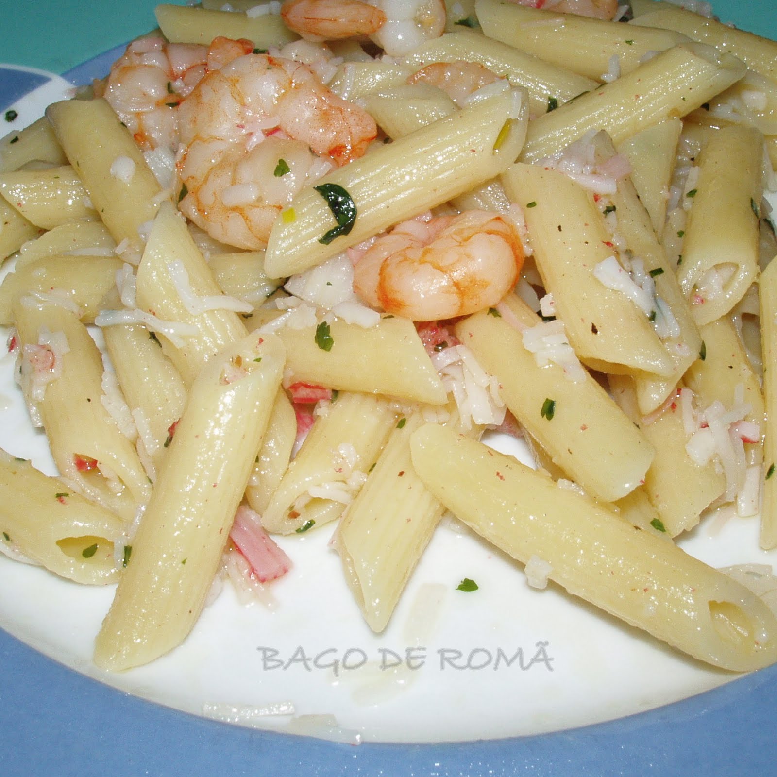 Em vez de esparguete usei massa penne, à qual adicionei umas barritas de delícias do mar que fizeram uma excelente companhia ao camarão. Ficou delicioso, com um sabor bem português.