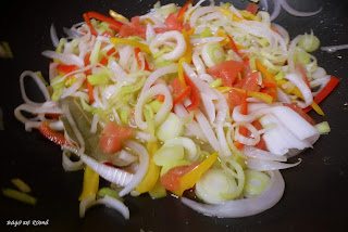 - Na wok deitar um fio de azeite, os alhos franceses em rodelas, o pimento em tiras e deixar saltear no azeite. Quando os espinafres estiverem descongelados, escorrer e juntar aos restantes legumes. Envolver e deixar estufar até ficarem amolecidos.