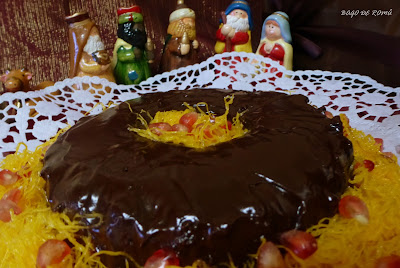 Este ano acordei com uma ideia diferente e para variar porque não fazer uma Coroa dos Reis com a mesma massa? Assim fiz, enformei-a numa forma pequena que tenho da Tupperware (mini-feiticieira) e cobri com a ganache de chocolate. Aproveitei para decorar com os fios de ovos e muitos bagos de romã, cumprindo assim a minha tradição deste dia. E não é que ficou tão bonita?