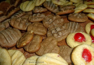 Massa Base + 30g de Amido de Milho ( Farinha Maisena) + 7,5g de açúcar baunilhado ( 1 saqueta) + cerejas cristalizadas para enfeitar. Coloquei 1/2 cereja em cada bolacha.