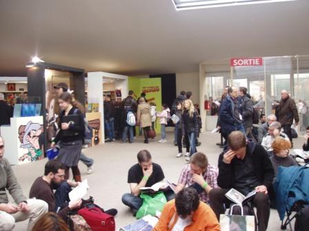 | Público lê enquanto aguarda pelos seus autores favoritos | | |